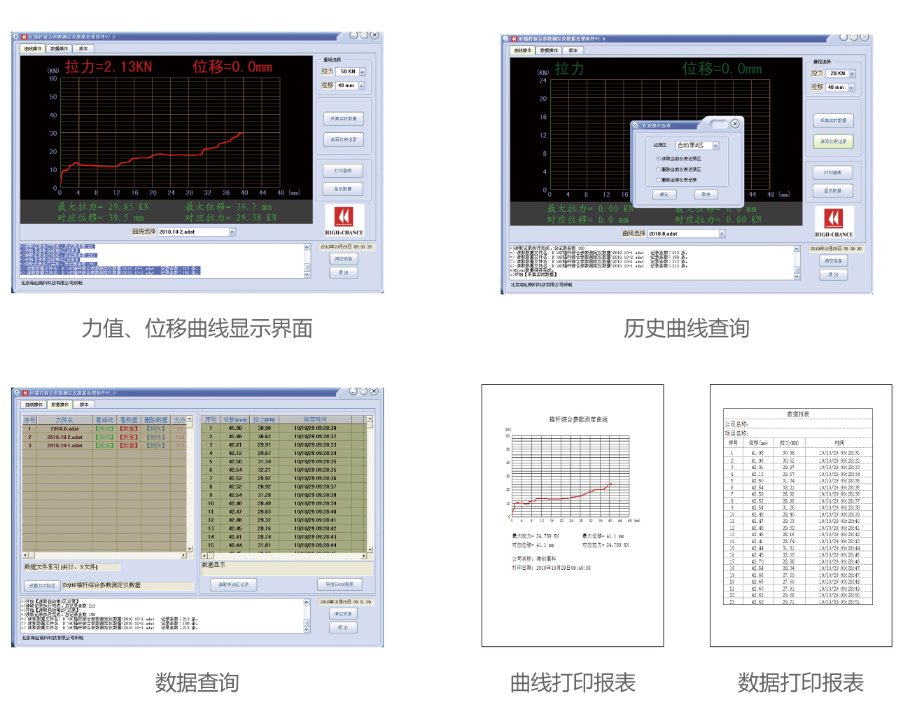 HCYL-60型锚杆综合参数测定仪是在原有锚杆拉拔仪测力的基础上,增加位移和环境温度的测量,根据力值和位移的逐渐变化绘制出测量曲线。此仪器具有强大的数据存储功能。在试验的全过程中将位移、力值及变化曲线定时自动存储记录在仪器中。